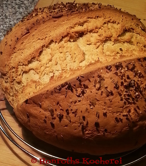 1150, 300g Weizenmehl 1050, 30g Sauerteig, ½ Würfel Hefe, 1 TL Brotgewürz, 550ml warmes